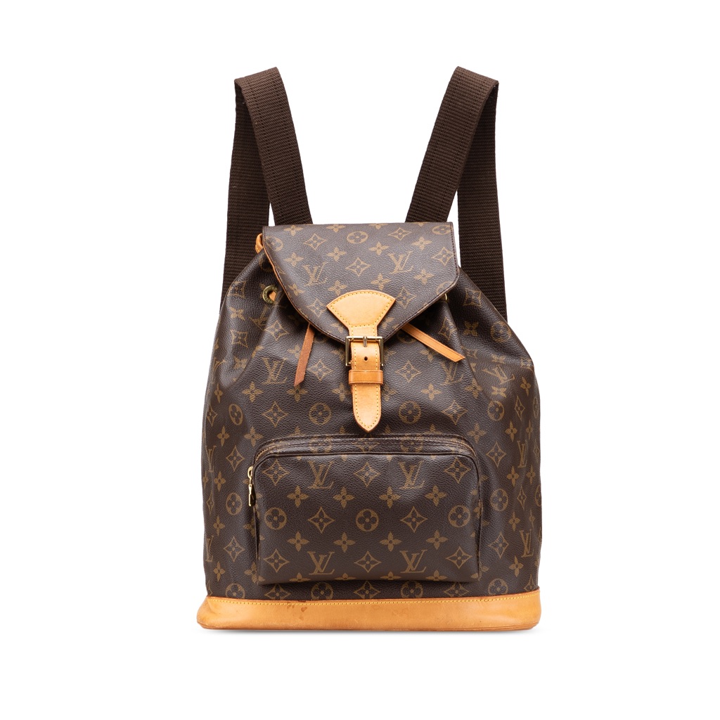 The Montsouris GM features a monogram canvas body with vachetta leather trim, adjustable flat back straps, a flap with belt buckle detail, a top drawstring closure, an exterior front zip pocket, and an interior slip pocket.
