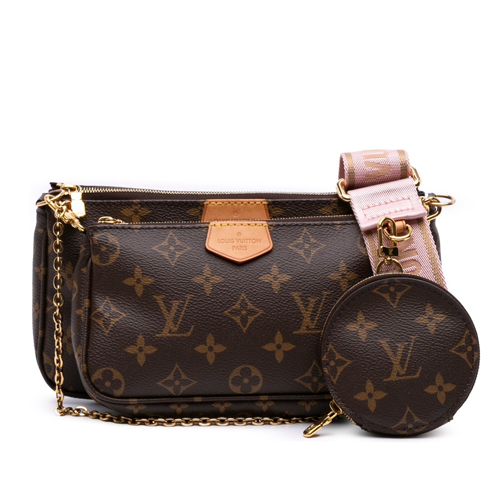 The Multi-Pochette Accessoires features a monogram canvas body, a detachable chain link strap, a detachable flat canvas shoulder strap, a top zip closure, an interior slip pocket, and removable mini pochette and coin pouch inclusions.