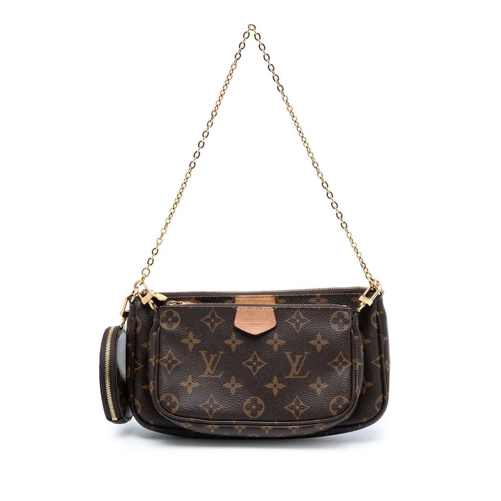 The Multi-Pochette Accessoires features a monogram canvas body, a detachable chain link strap, a detachable flat canvas shoulder strap, a top zip closure, an interior slip pocket, and removable mini pochette and coin pouch inclusions.