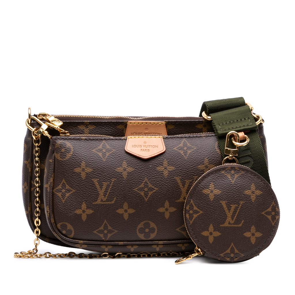 The Multi-Pochette Accessoires features a monogram canvas body, a detachable chain link strap, a detachable flat canvas shoulder strap, a top zip closure, an interior slip pocket, and removable mini pochette and coin pouch inclusions.