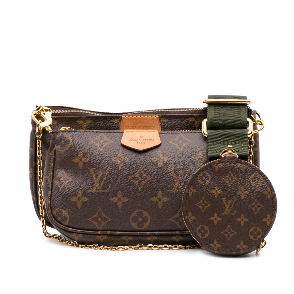 The Multi-Pochette Accessoires features a monogram canvas body, a detachable chain link strap, a detachable flat canvas shoulder strap, a top zip closure, an interior slip pocket, and removable mini pochette and coin pouch inclusions.