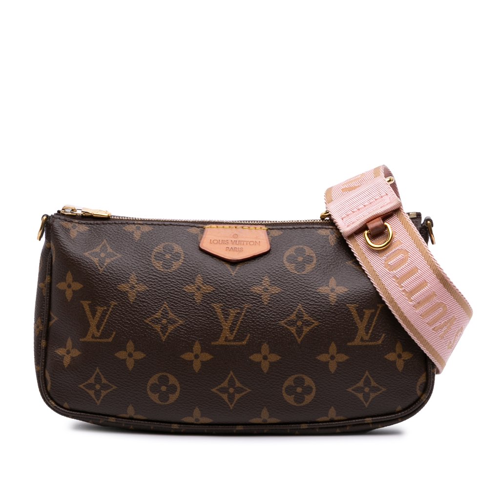 The Multi-Pochette Accessoires features a monogram canvas body, a detachable chain link strap, a detachable flat canvas shoulder strap, a top zip closure, an interior slip pocket, and removable mini pochette and coin pouch inclusions.