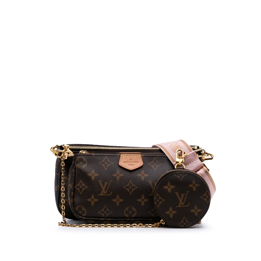 The Multi-Pochette Accessoires features a monogram canvas body, a detachable chain link strap, a detachable flat canvas shoulder strap, a top zip closure, an interior slip pocket, and removable mini pochette and coin pouch inclusions.