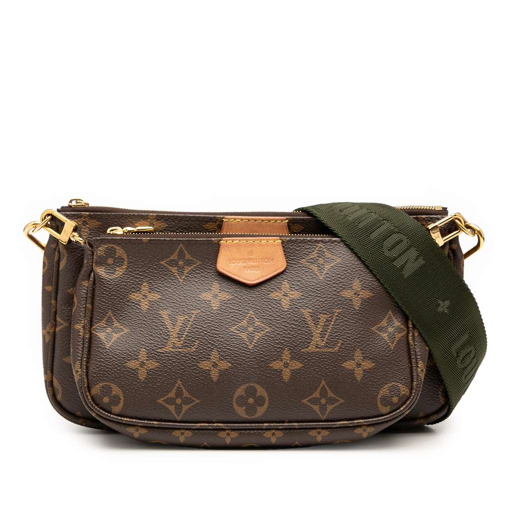 The Multi-Pochette Accessoires features a monogram canvas body, a detachable chain link strap, a detachable flat canvas shoulder strap, a top zip closure, an interior slip pocket, and removable mini pochette and coin pouch inclusions.