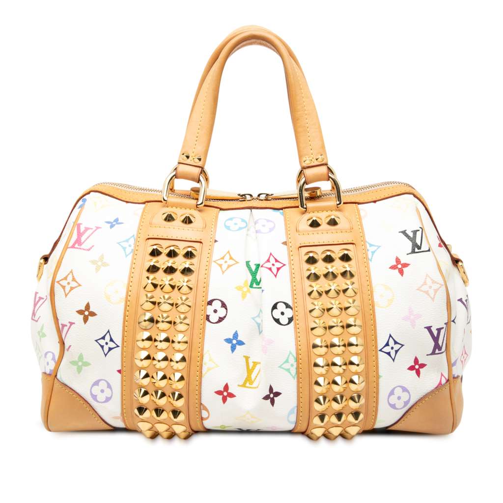 The Courtney MM features a monogram multicolore canvas body with studded vachetta leather trim, flat vachetta leather handles, a top zip closure, and interior slip pockets.