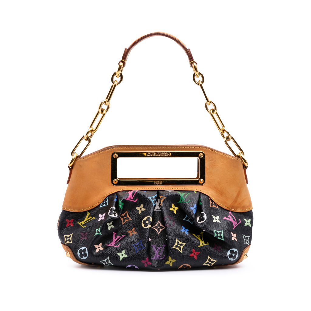 The Judy PM features a monogram multicolore canvas body with vachetta leather trim, cut-out handles, a chain link strap, an open top with magnetic snap button closure, and interior flap and slip pockets.
