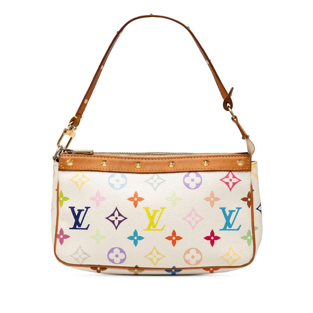 The Pochette Accessoires features a monogram multicolore canvas body with studded vachetta leather trim, a flat vachetta leather strap with gold-tone studs, and a top zip closure.