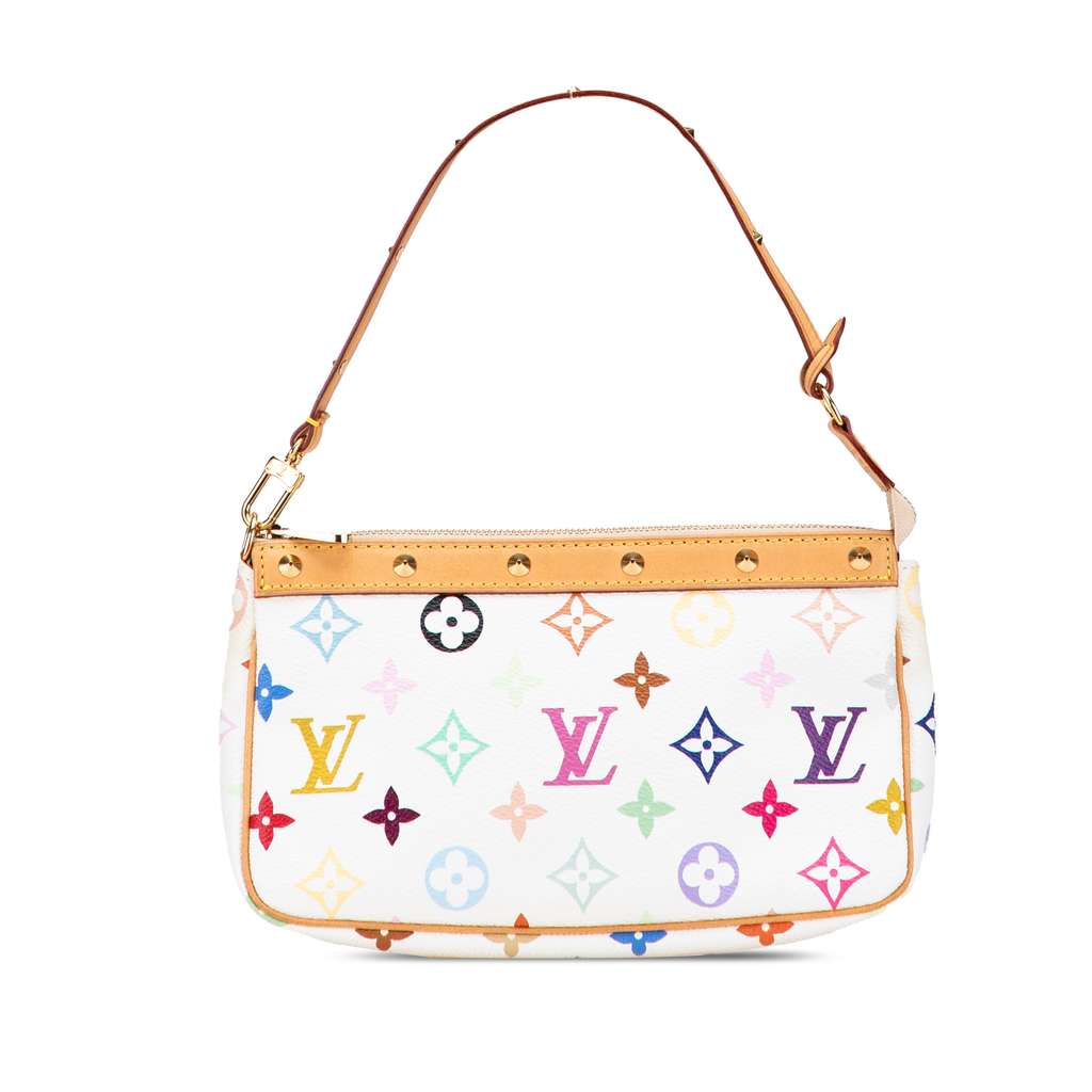The Pochette Accessoires features a monogram multicolore canvas body with studded vachetta leather trim, a flat vachetta leather strap with gold-tone studs, and a top zip closure.