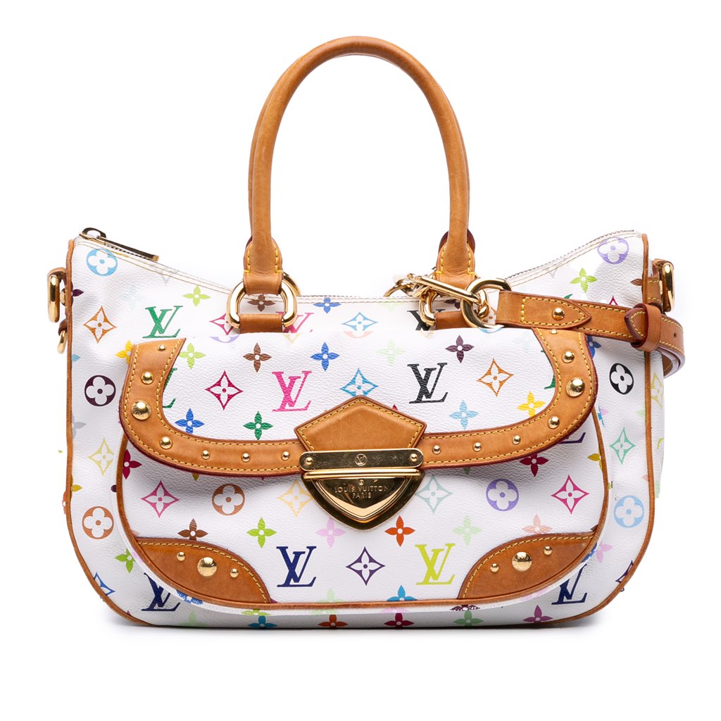 The Rita Bag features a monogram multicolore canvas body with vachetta leather trim, rolled vachetta leather handles, a detachable chain strap with leather shoulder guard, a top zip closure, an exterior front flap pocket with push lock closure, an exterior back zip pocket, and interior slip pockets.