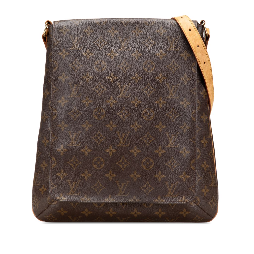 The Musette Salsa features a monogram canvas body, an adjustable vachetta shoulder strap with buckle details, a front flap with a magnetic closure, and an interior slip pocket.
