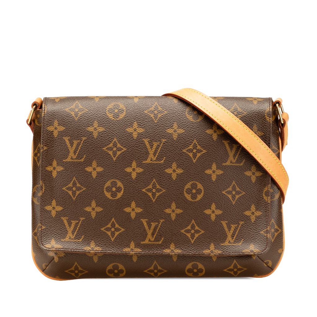 The Musette Tango features a monogram canvas body, an adjustable flat vachetta leather strap, a front flap with a magnetic closure, and an interior slip pocket.