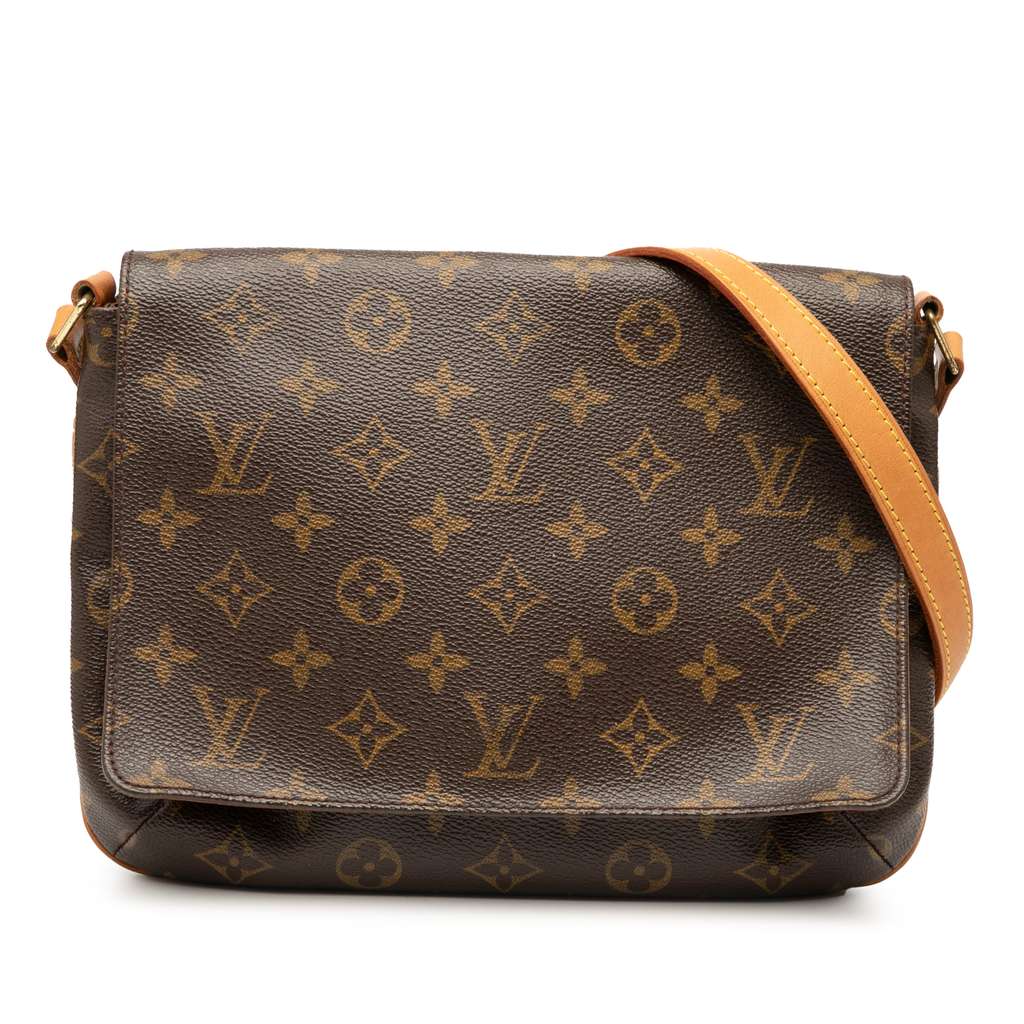 The Musette Tango features a monogram canvas body, a flat vachetta leather strap, a front flap with a magnetic closure, and an interior slip pocket.