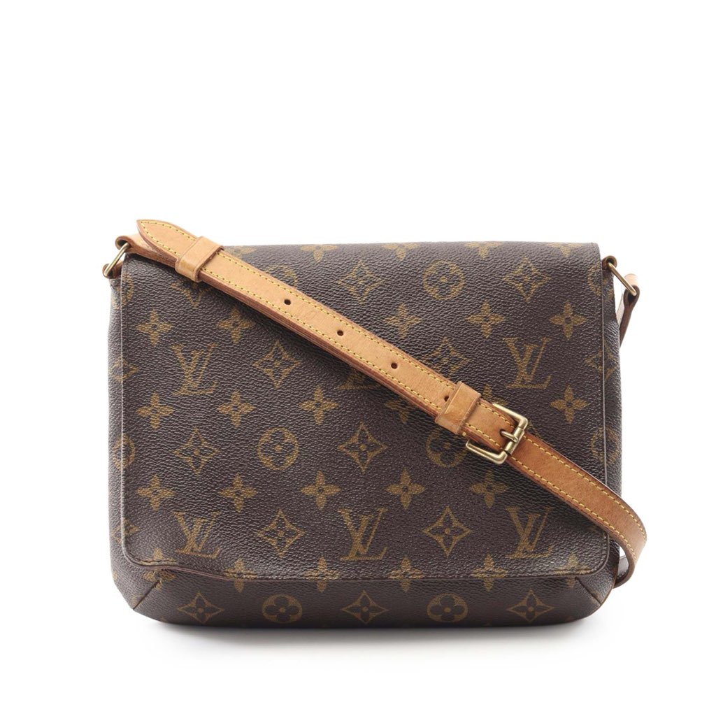 The Musette Tango features a monogram canvas body, an adjustable flat vachetta leather shoulder strap, a front flap with a magnetic closure, and an interior slip pocket.