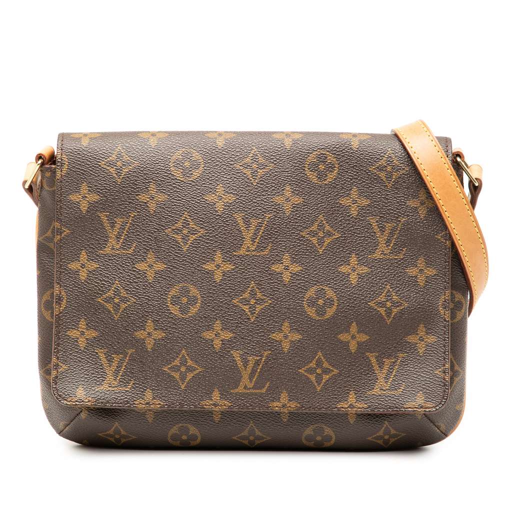 The Musette Tango features a monogram canvas body, a leather shoulder strap, a front flap with a magnetic closure, and an interior slip pocket.