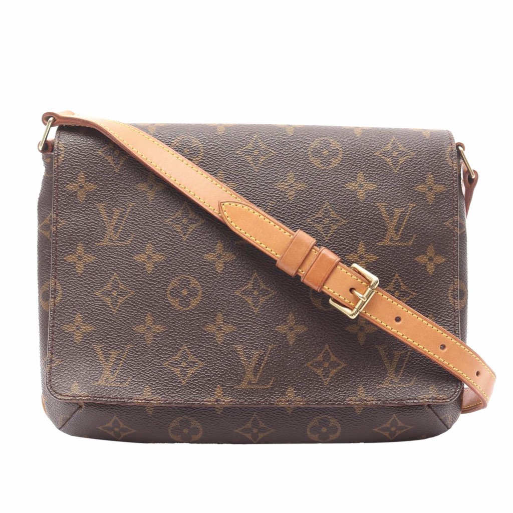 The Musette Tango features a monogram canvas body with vachetta leather trim, an adjustable vachetta leather shoulder strap, a front flap with magnetic snap closure, and an interior slip pocket.