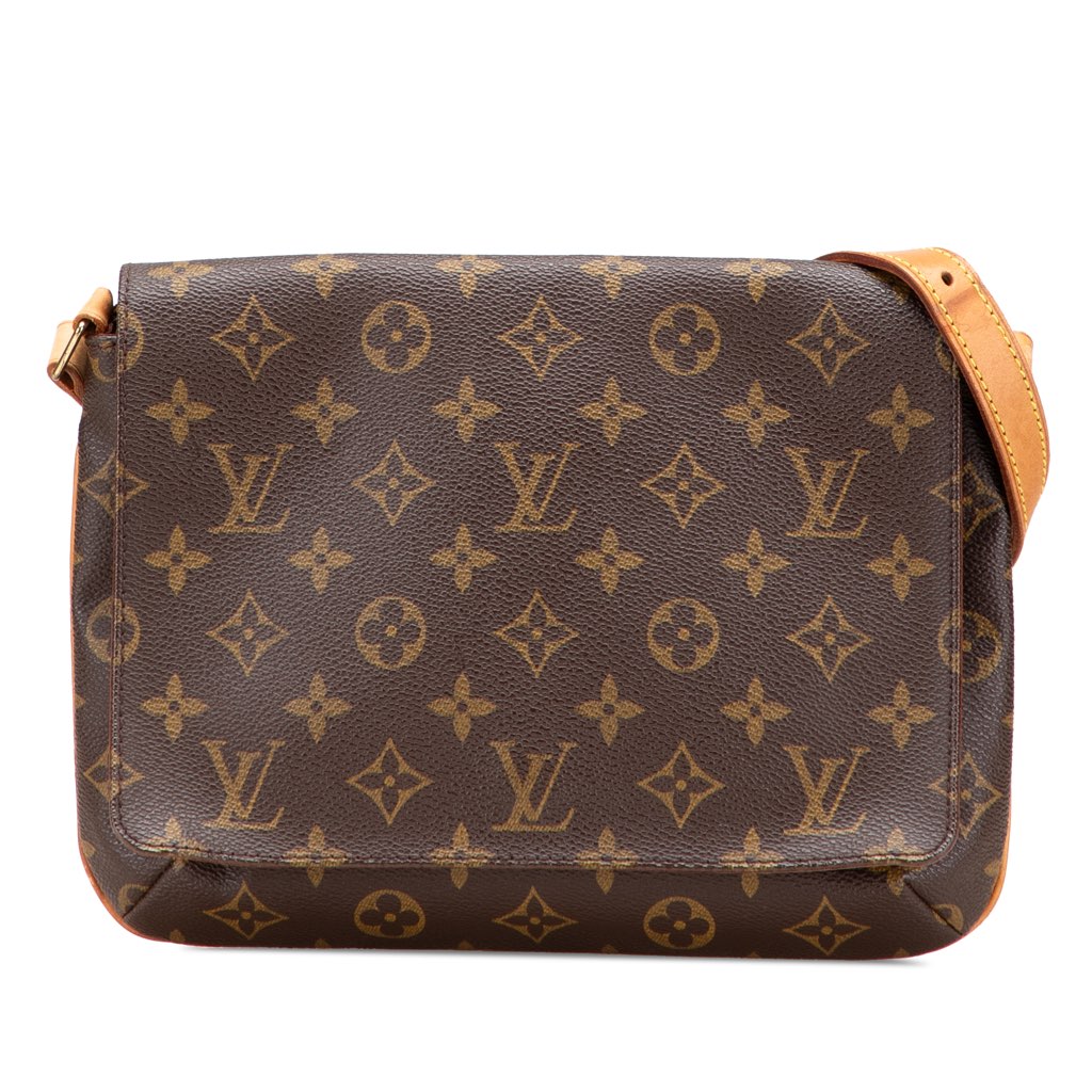 The Musette Tango features a monogram canvas body, a vachetta leather shoulder strap, a front flap with a magnetic closure, and an interior slip pocket.