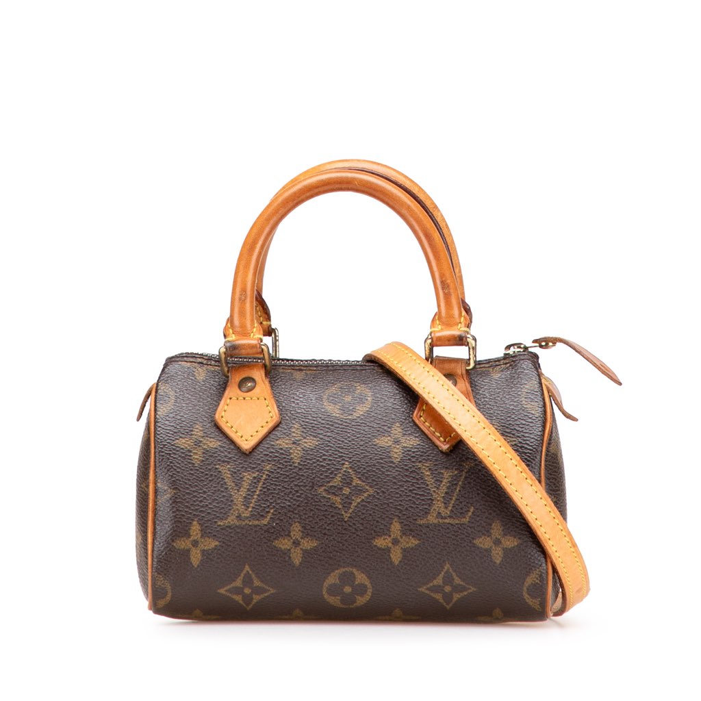 The Nano Speedy features a monogram canvas body with vachetta leather trim, rolled vachetta leather handles, a detachable vachetta leather shoulder strap, and a top zip closure.
