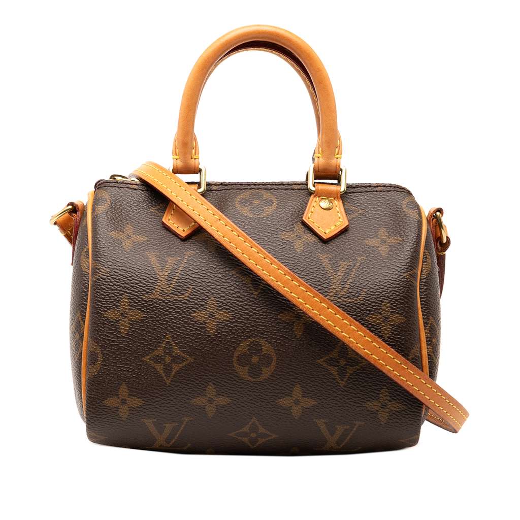 The Nano Speedy features a monogram canvas body with vachetta leather trim, rolled vachetta leather handles, a detachable flat vachetta leather shoulder strap, and a top zip closure.