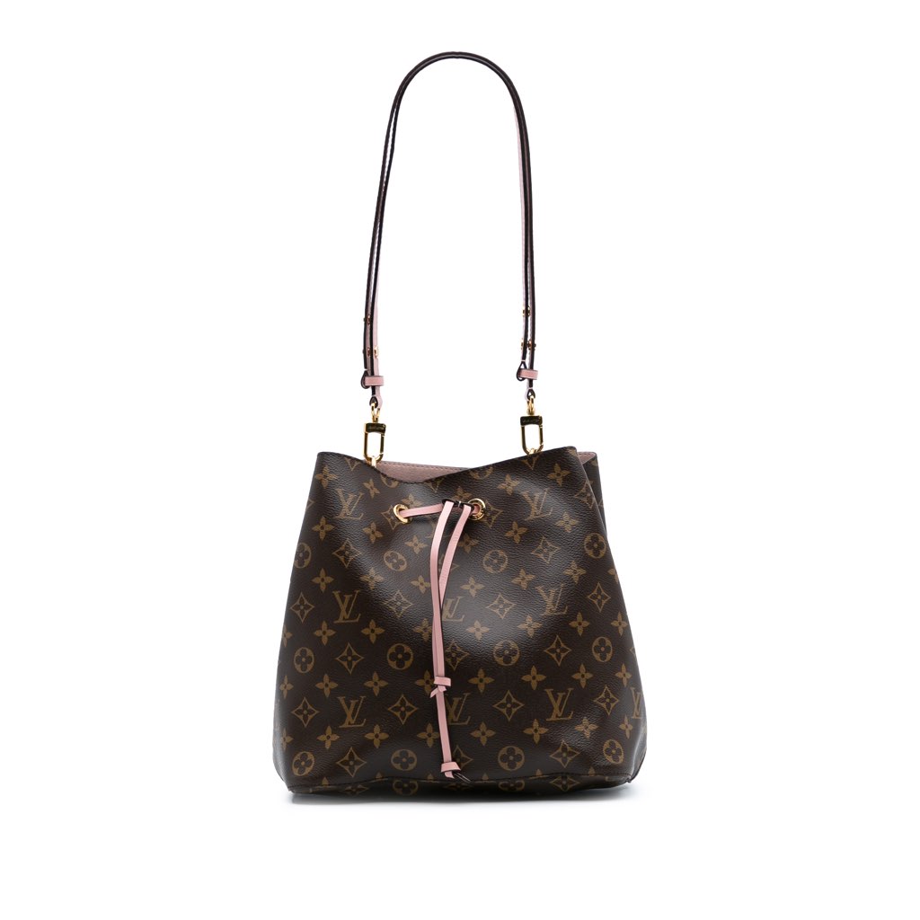 The Neonoe MM features a monogram canvas body, a detachable flat leather strap, an open top with drawstring closure, and an interior zip pocket.