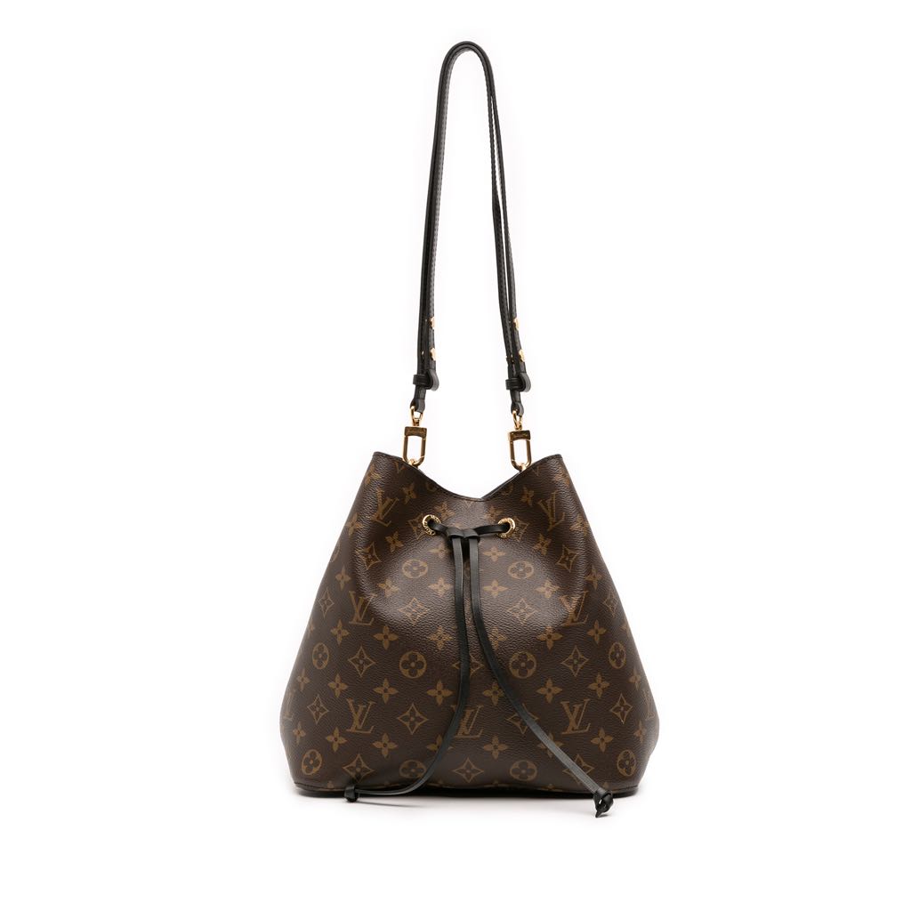 The Neonoe MM features a monogram canvas body, a detachable flat leather strap, an open top with a drawstring closure, and an interior zip pocket.