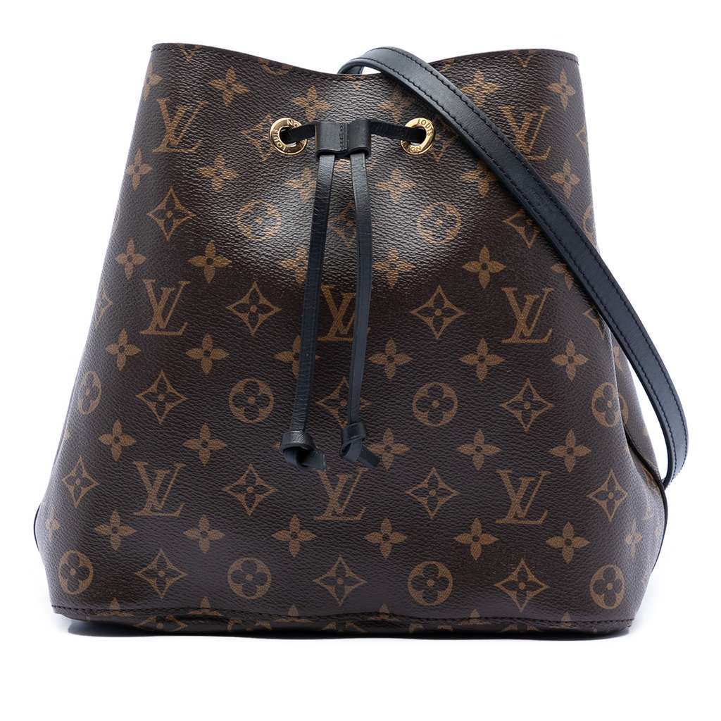 The Neonoe features a monogram canvas body, a detachable flat leather strap, an open top with a drawstring closure, and an interior zip pocket.