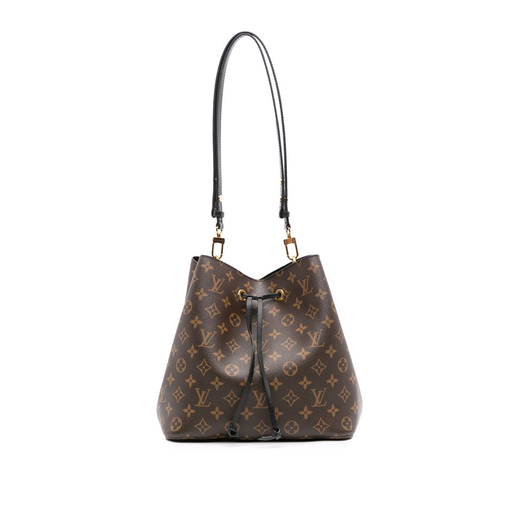 The Neonoe features a monogram canvas body, a detachable flat leather strap, an open top with a drawstring closure, and an interior zip pocket.