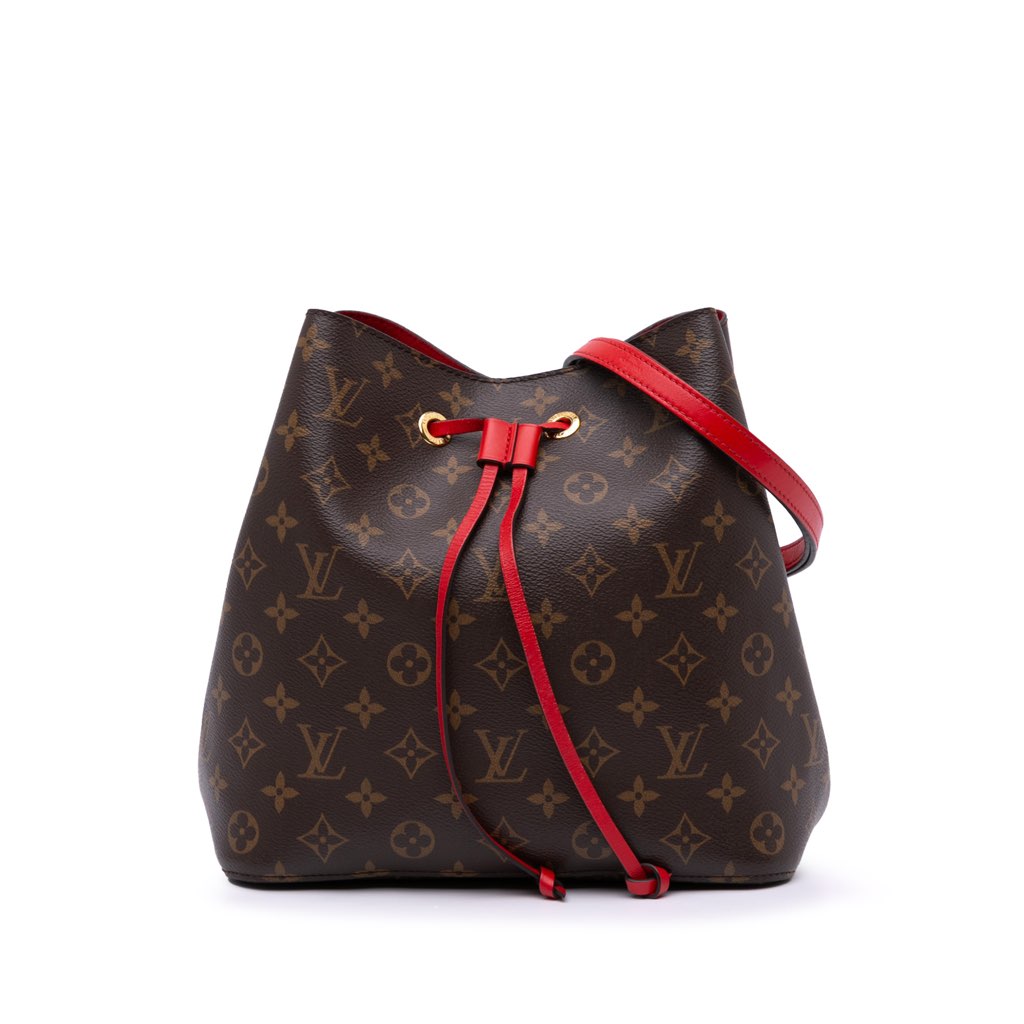 The Neonoe features a monogram canvas body, an adjustable and detachable flat leather strap, a top drawstring closure, and an interior zip pocket.