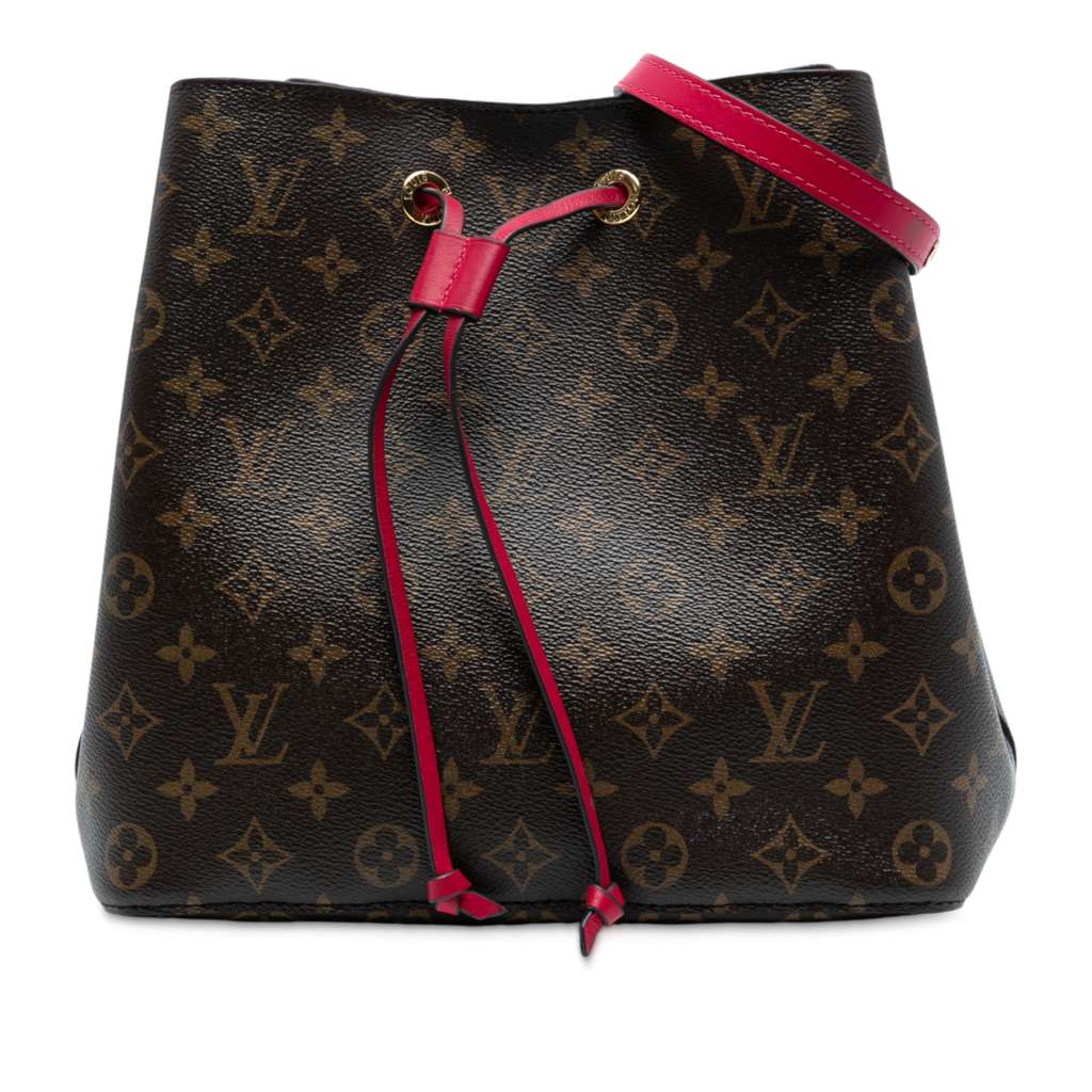 The Neonoe MM features a monogram canvas body, an adjustable and detachable flat leather strap, an open top with a drawstring closure, and an interior zip pocket. The strap was repainted.