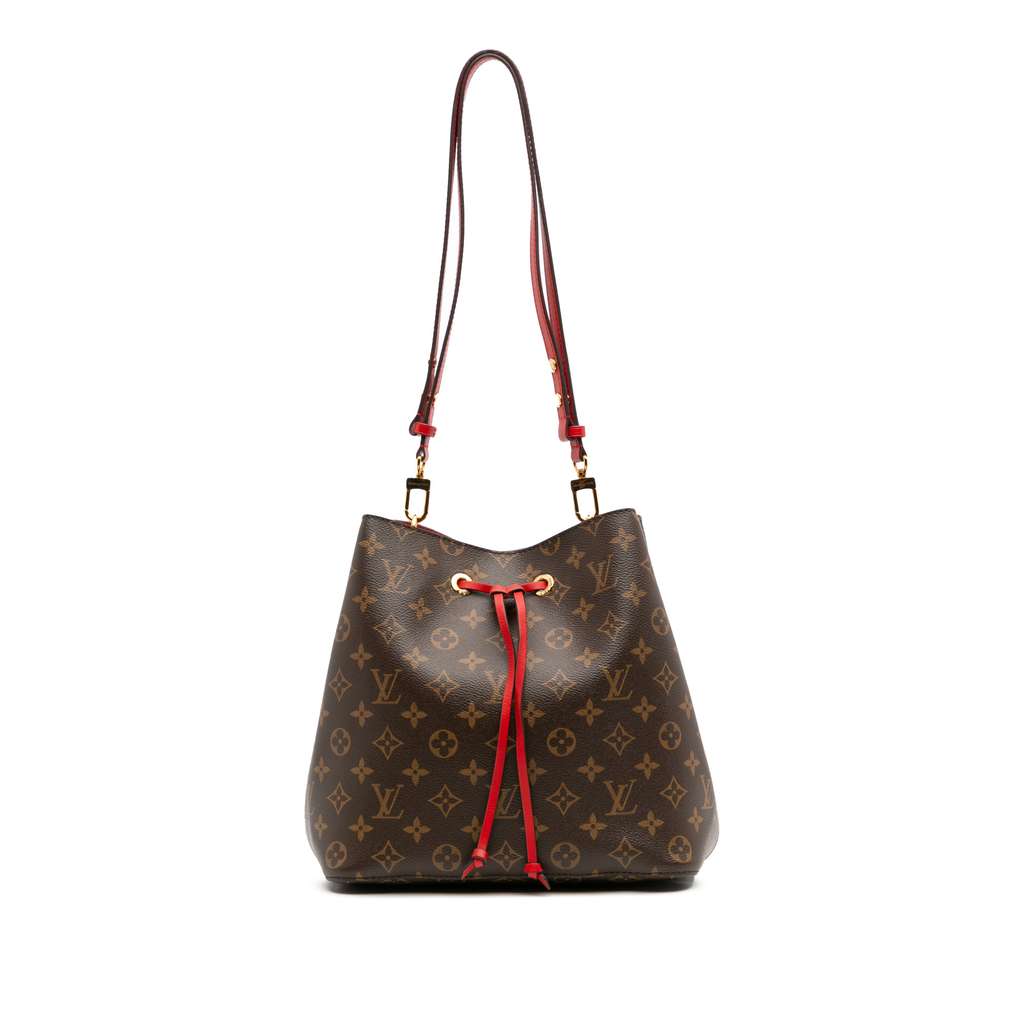 The Neonoe features a monogram canvas body, an adjustable and detachable flat leather strap, a top drawstring closure, and an interior zip pocket.
