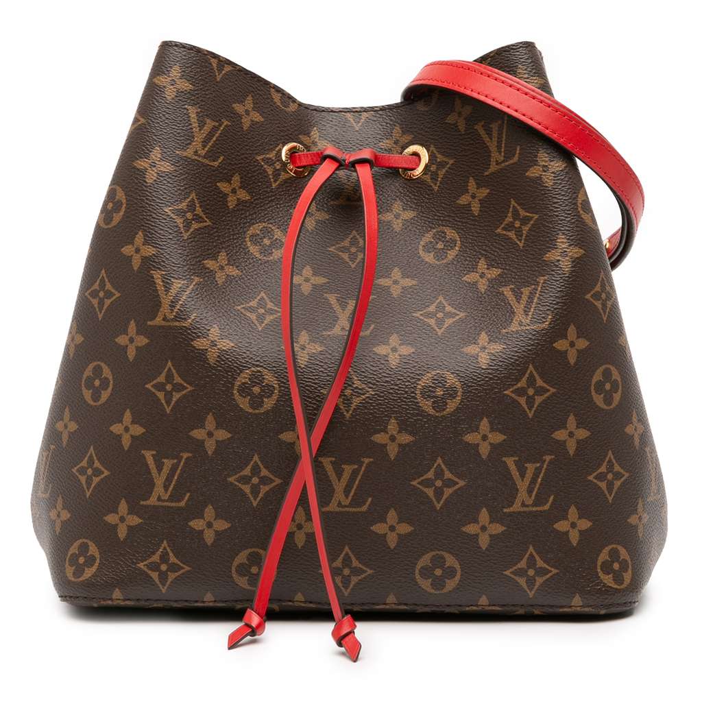 The Neonoe features a monogram canvas body, an adjustable and detachable flat leather strap, a top drawstring closure, and an interior zip pocket.