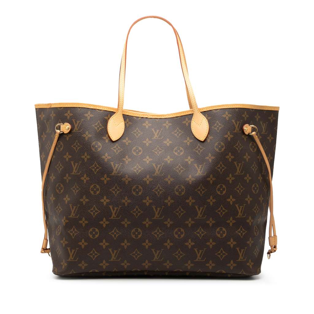 The Neverfull GM features a monogram canvas body with vachetta leather trim, flat vachetta leather handles, an open top with lobster clasp closure, and an interior zip pocket.