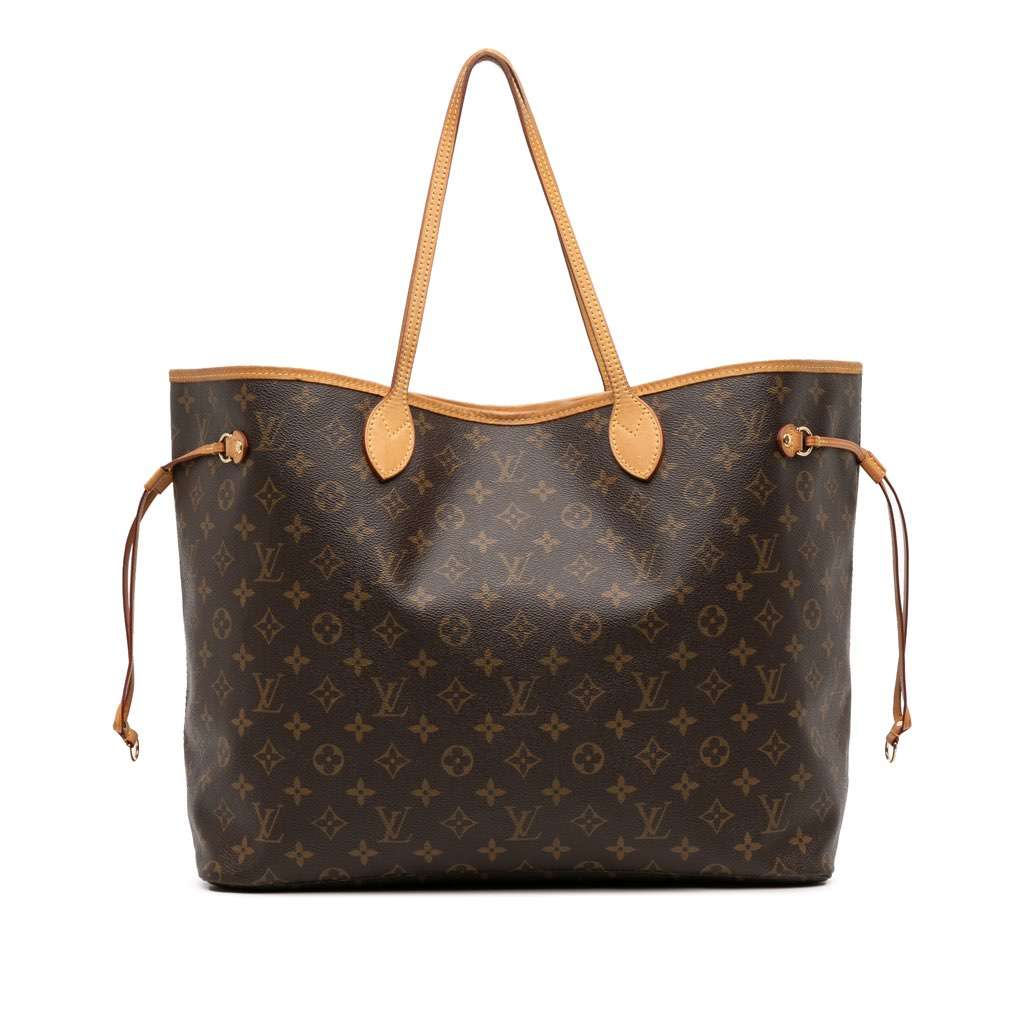 The Neverfull GM features a monogram canvas body with vachetta leather trim, flat vachetta leather handles, an open top with a lobster clasp closure, and an interior zip pocket.