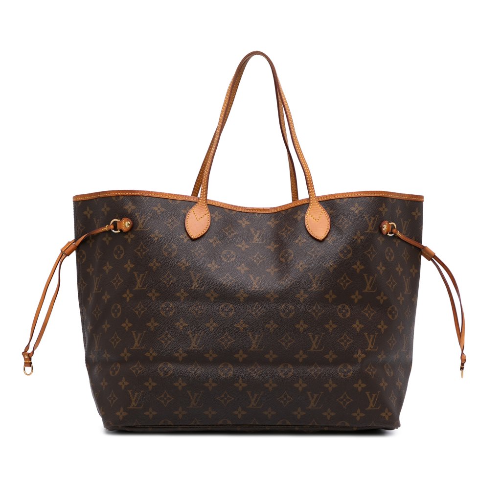 The Neverfull features a monogram canvas body with vachetta leather trim, flat vachetta leather handles, an open top with a lobster clasp closure, and an interior zip pocket.