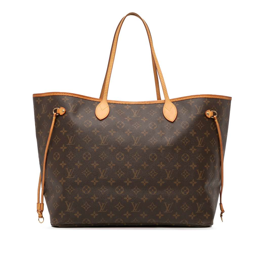 The Neverfull GM features a monogram canvas body, flat leather handles, a top lobster claw clasp closure, and an interior zip pocket.
