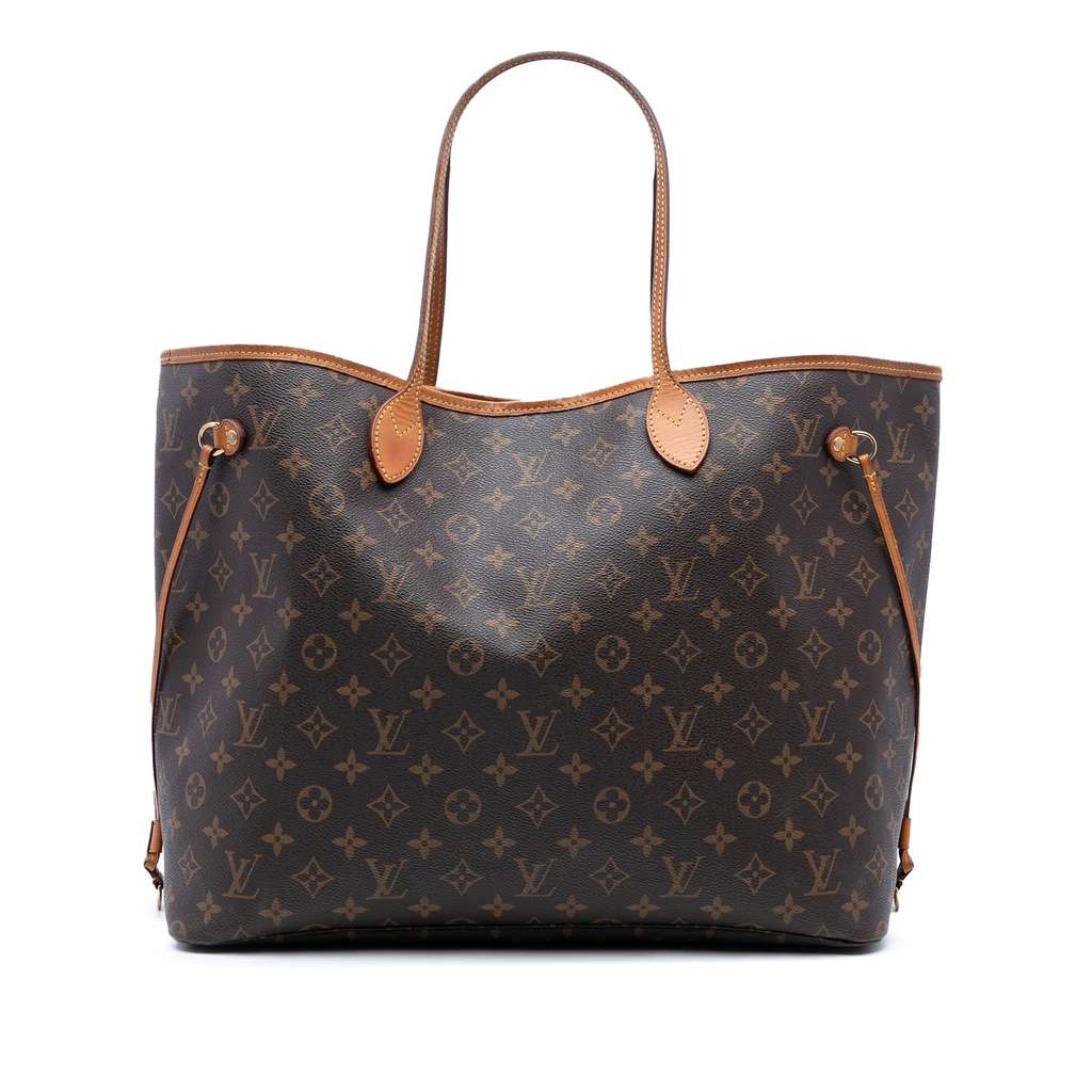 The Neverfull GM features a monogram canvas body with vachetta leather trim, flat vachetta leather straps, an open top with lobster clasp closure, an interior zip pocket, and a pouch inclusion.