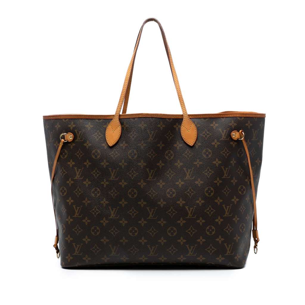 The Neverfull GM features a monogram canvas body with vachetta leather trim, flat vachetta leather handles, an open top with lobster clasp closure, and an interior zip pocket.