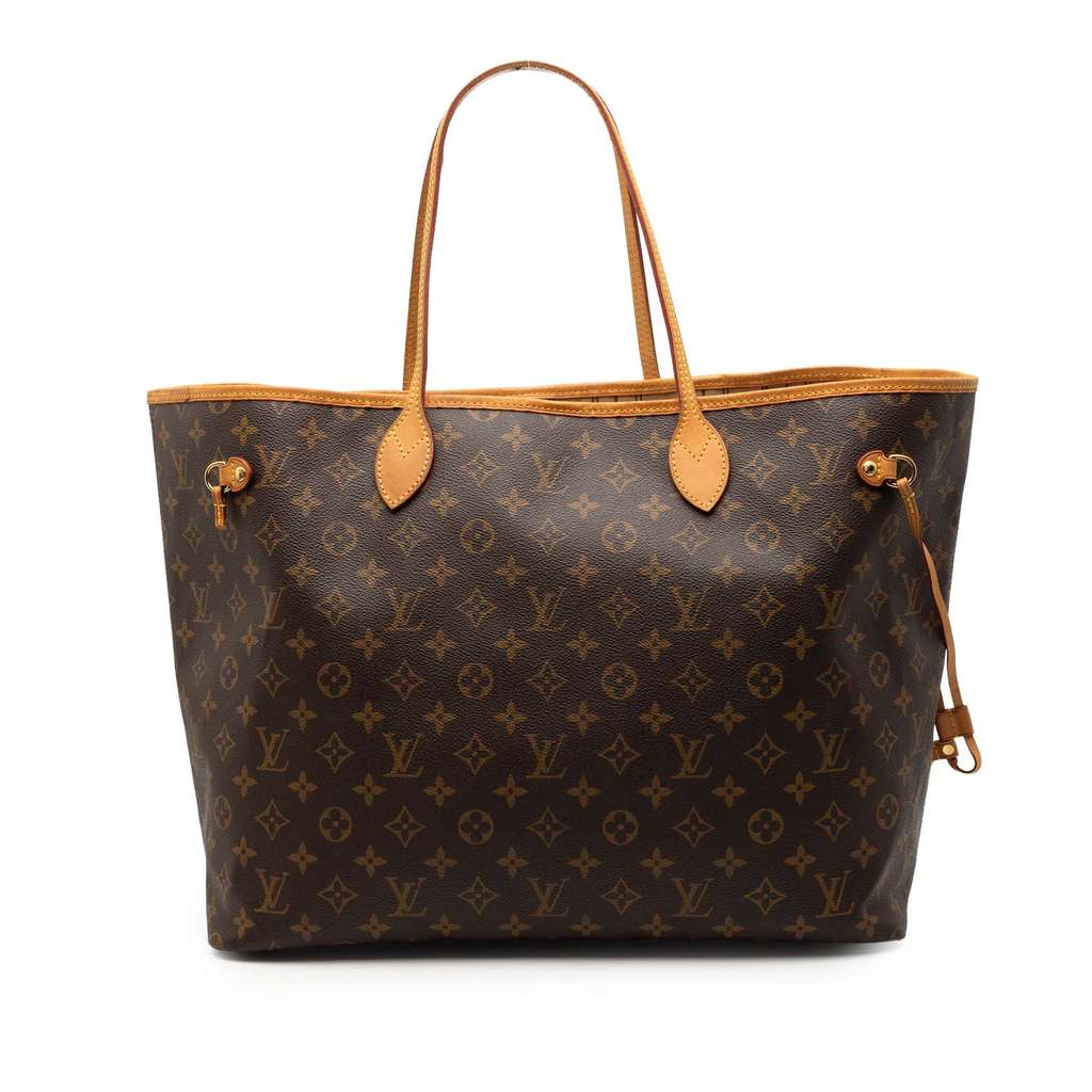 The Neverfull GM features a monogram canvas body with vachetta leather trim, flat vachetta leather handles, an open top with lobster clasp closure, and an interior zip pocket. Strap has been repaired.
