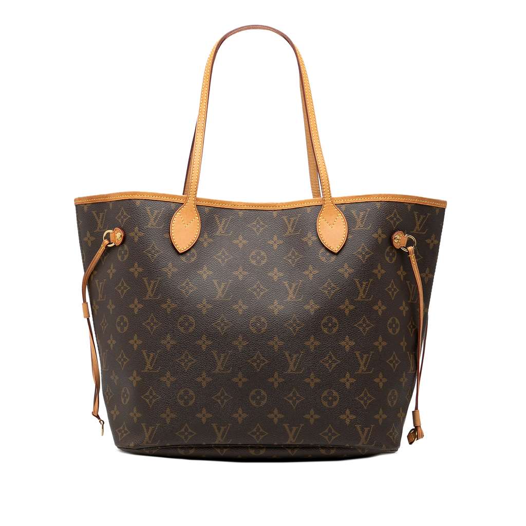 The Neverfull MM features a monogram canvas body with vachetta leather trim, flat vachetta leather handles, an open top with a lobster clasp closure, and an interior zip pocket.