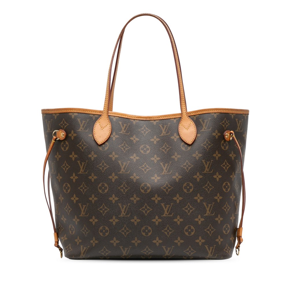 The Neverfull MM features a monogram canvas body with vachetta leather trim, flat vachetta leather handles, an open top with a lobster clasp closure, and an interior zip pocket.
