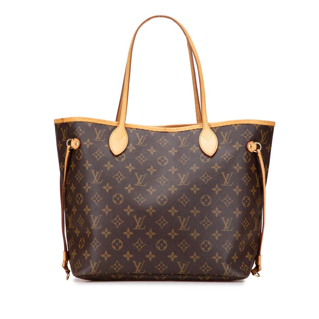 The Neverfull MM features a monogram canvas body with vachetta leather trim, flat vachetta leather straps, an open top with lobster clasp closure, and an interior zip pocket.