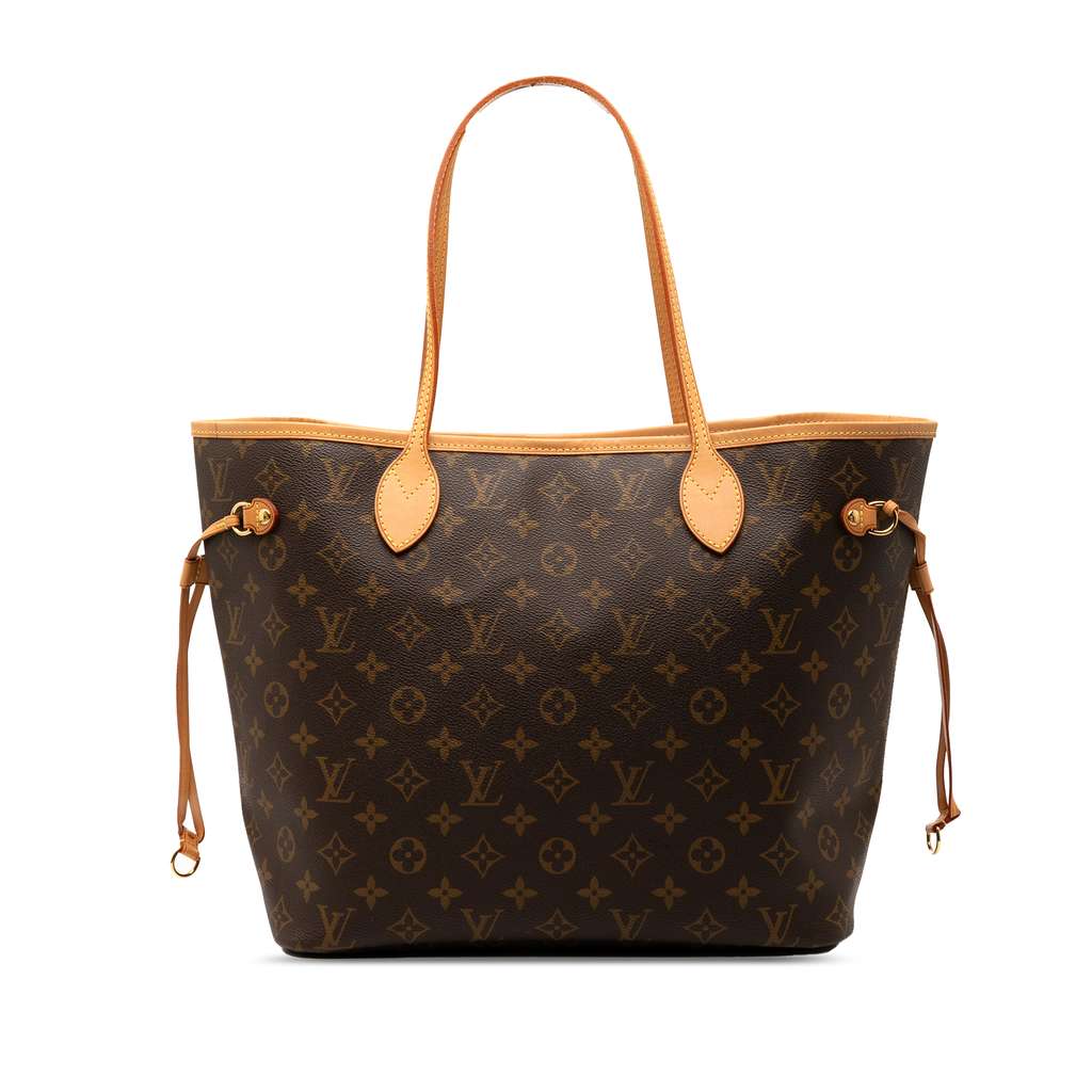 The Neverfull MM features a monogram canvas body with vachetta leather trim, flat vachetta leather handles, an open top with lobster clasp closure, and an interior zip pocket.