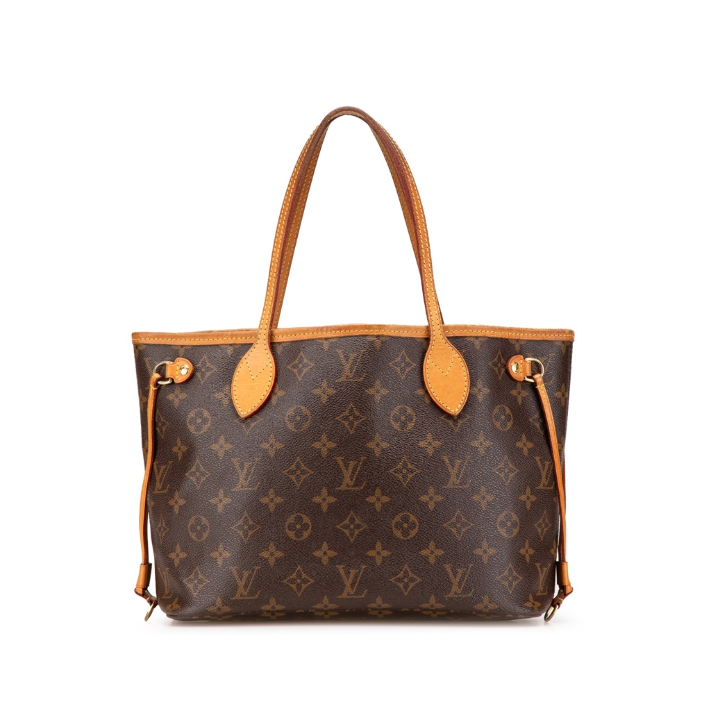 The Neverfull PM features a monogram canvas body with vachetta leather trim, flat vachetta leather straps, an open top with a lobster claw clasp closure, and an interior zip pocket.