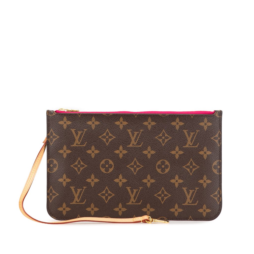This pouch features a monogram canvas body, a flat vachetta leather wrist strap, a top zip closure, and an interior slip pocket.