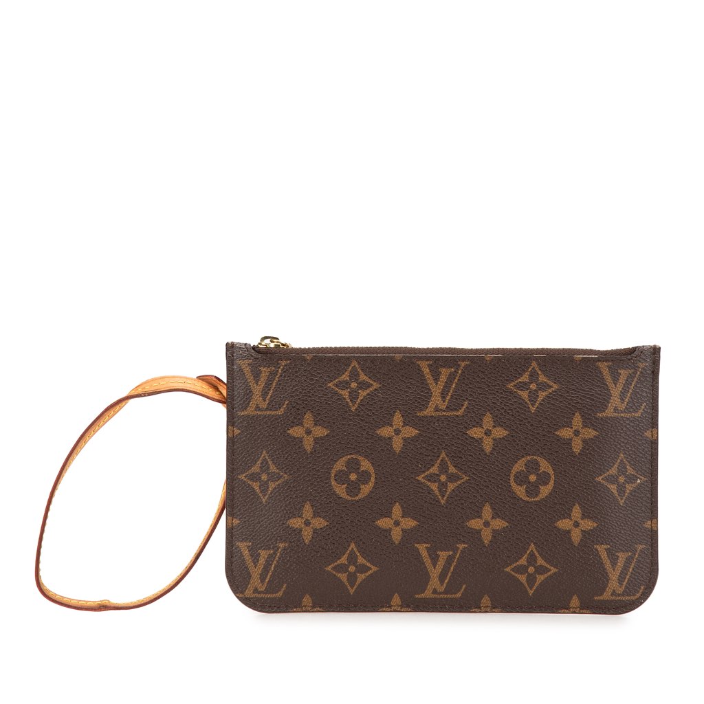 This pouch features a monogram canvas body, a flat vachetta leather wrist strap, a top zip closure, and an interior slip pocket.