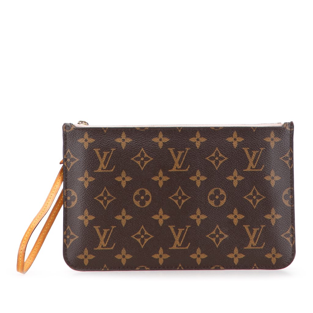 This Pouch features a monogram canvas body, a flat vachetta leather wrist strap, a top zip closure, and an interior slip pocket.