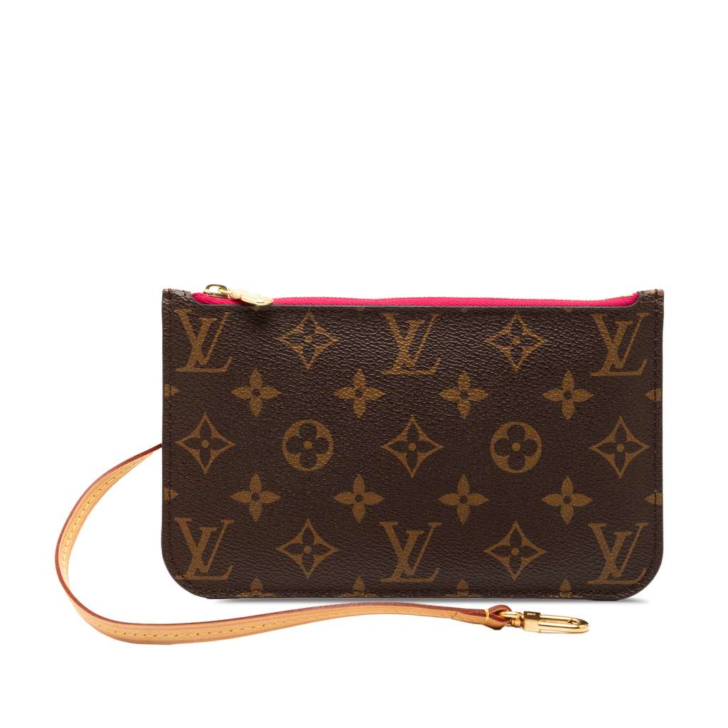 The Neverfull pouch features a monogram canvas body, a flat vachetta leather wrist strap, a top zip closure, and an interior slip pocket.