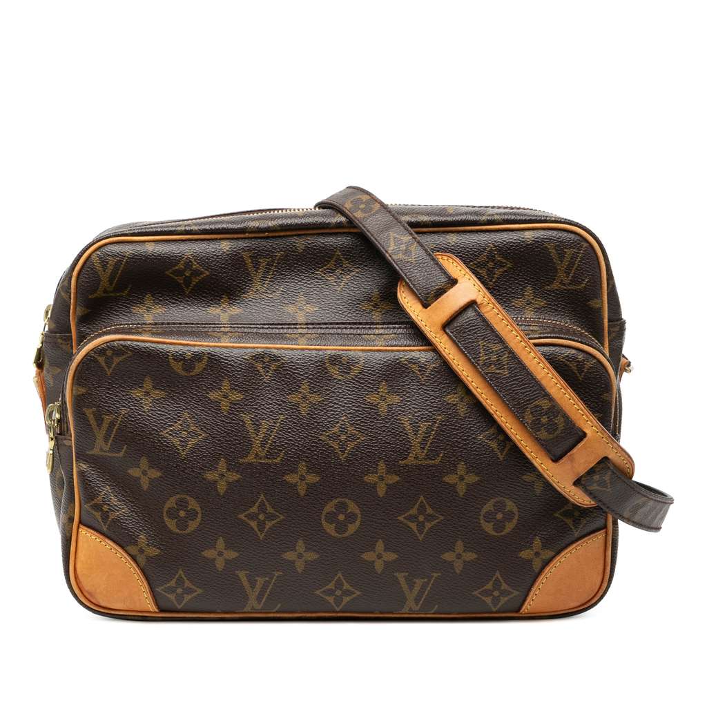 The Nil features a monogram canvas body with vachetta leather trim, an adjustable flat shoulder strap, a top zip closure, an exterior zip compartment, and an interior zip pocket.