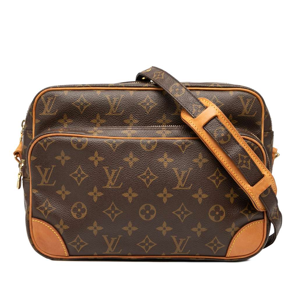 The Nil features a monogram canvas body with vachetta leather trim, an adjustable flat shoulder strap, a top zip closure, an exterior zip compartment, and an interior zip pocket.