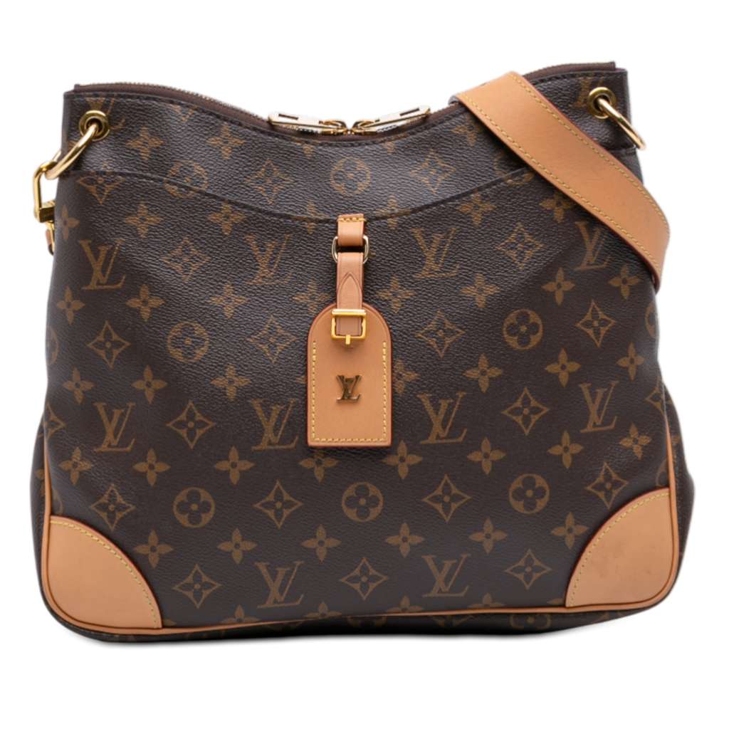 The Odeon MM features a monogram canvas body with vachetta leather trim, an adjustable flat vachetta leather strap, a top zip closure, an exterior slip pocket, and an interior slip pocket.
