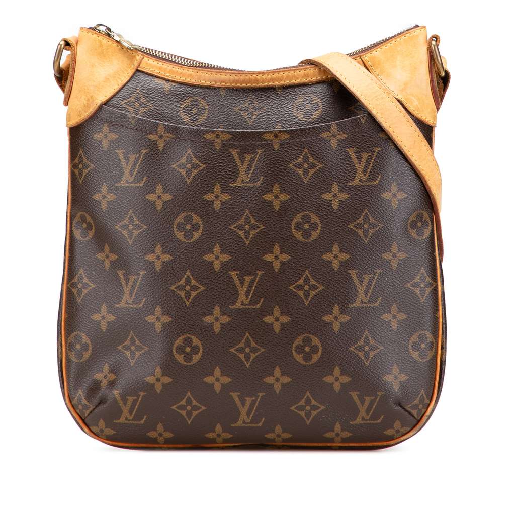 The Odeon PM features a monogram canvas body with vachetta leather trim, an adjustable flat vachetta leather strap, a top zip closure, an exterior front slip pocket, and interior slip pockets.